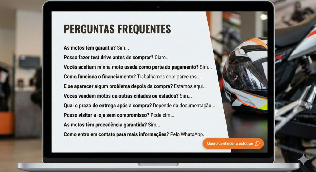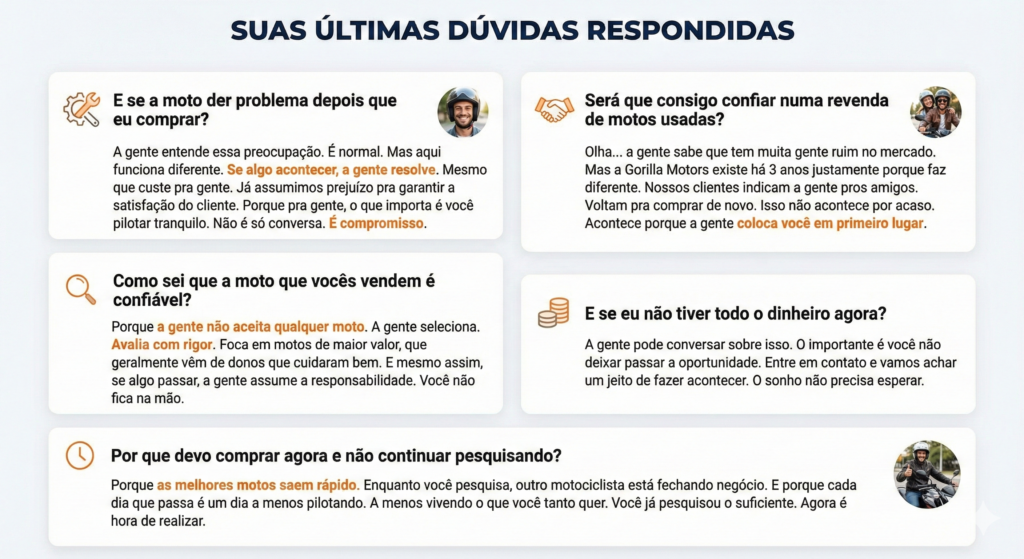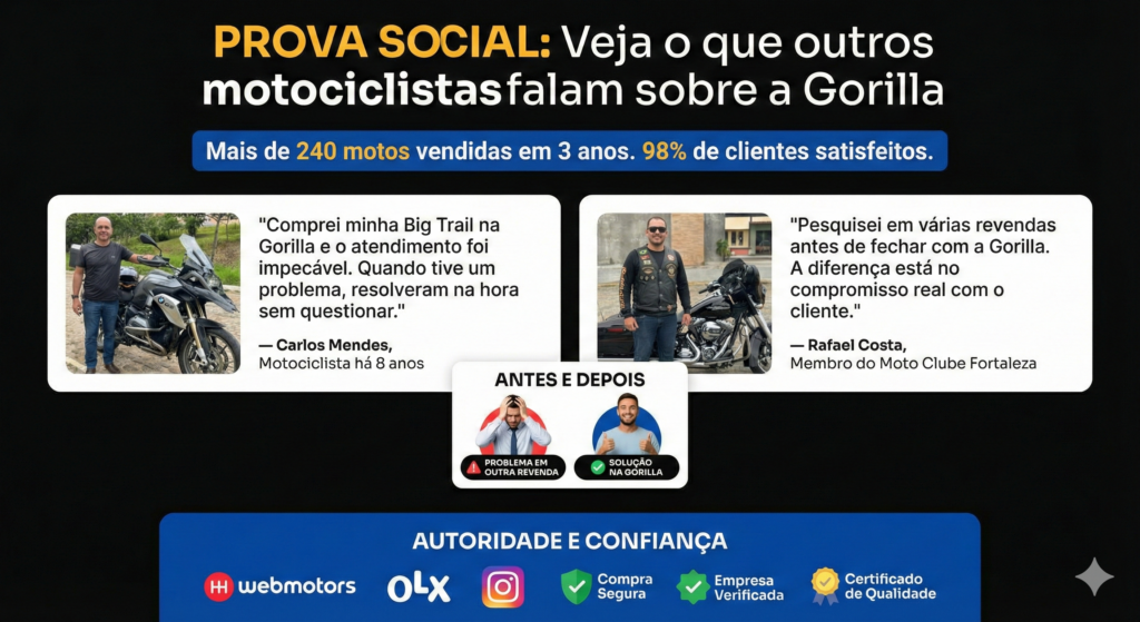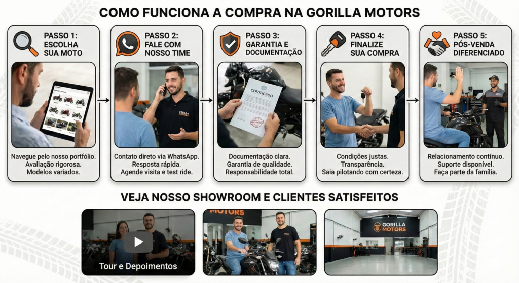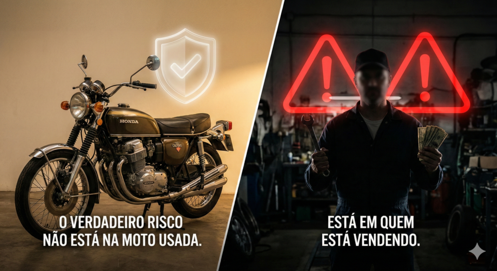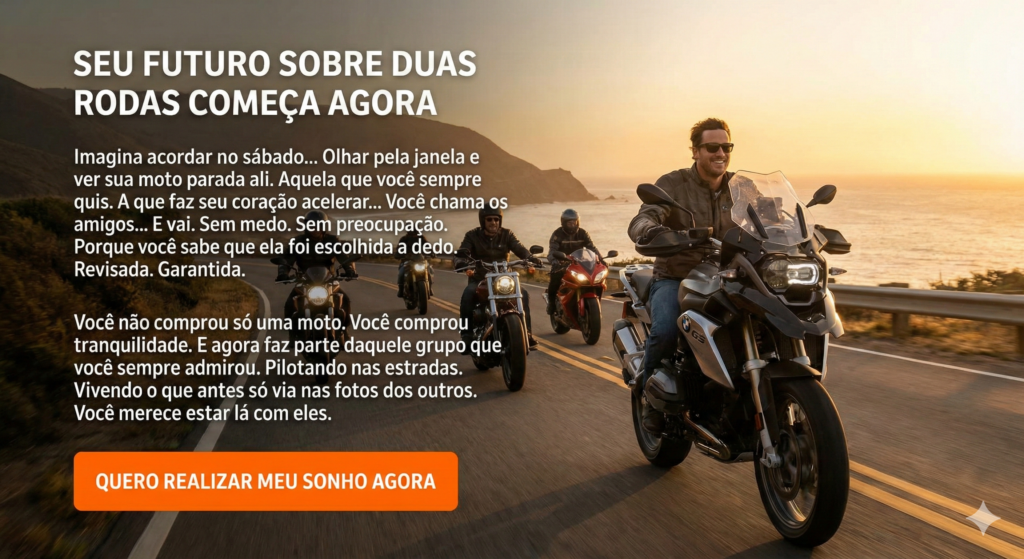 E não é pra menos. Comprar moto usada virou loteria. A maioria das revendas só quer empurrar o estoque. Escondem defeito, somem depois da venda, deixam você na mão. E quando dá problema, a frustração vai muito além do dinheiro perdido. É a sensação de ter sido enganado justamente na compra que você tanto sonhou.